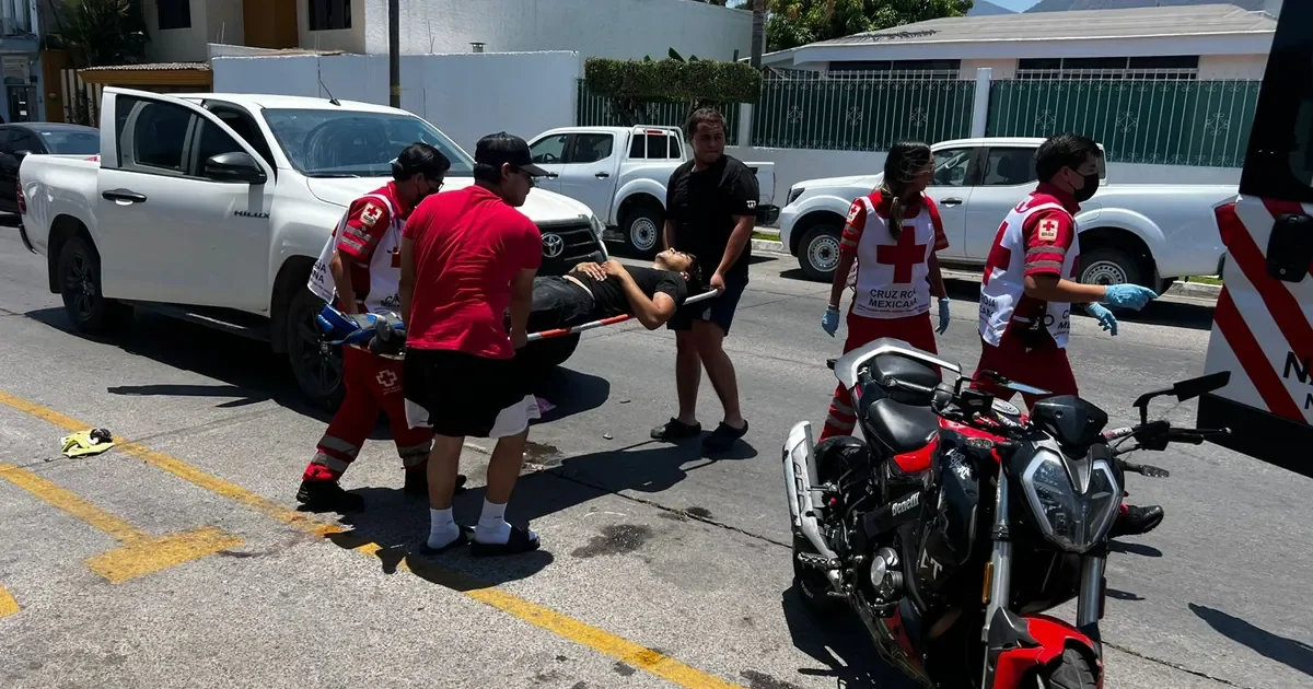 Un accidente vial registrado en el cruce de Avenida del Valle y Roma, Ciudad del Valle, dejó a un motociclista con fractura expuesta en la pierna derecha y posible amputación parcial, tras un choque múltiple entre tres vehículos.